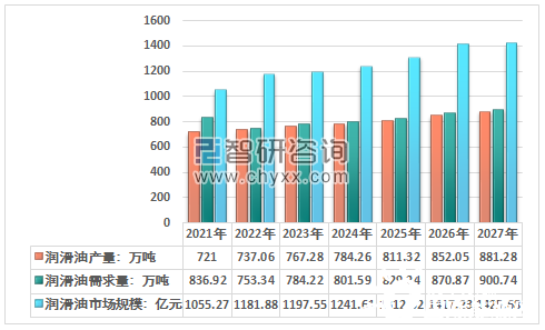 預(yù)計到2027年潤滑油產(chǎn)量將達(dá)到881.28萬噸,潤滑油消費量將達(dá)到900.74萬噸,市場規(guī)模將達(dá)到1425.68億元。